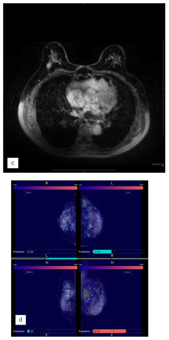 In Japan, MRI surveillance after unilateral BC surgery is generally not covered by insurance, except in cases such as hereditary breast and ovarian cancer syndrome (HBOC) [,]. Recent advancements in deep learning-based artificial intelligence (AI) have significantly outpaced traditional computer-aided detection systems in breast imaging diagnostics []. Studies have shown that AI can facilitate the work of radiologists without compromising diagnostic quality []. Despite most people undergoing screening turning out to be cancer-free, AI systems are capable of identifying normal mammary glands and can be used for either primary or secondary readings, potentially enhancing screening efficiency [,,,]. AI also holds promise for pre-diagnostically identifying high-risk BC cases, potentially reducing intermediate-stage diagnosis and false-negative rates [,,]. After unilateral BC surgery, MG interpretation becomes more complex. Usually, when reading MG, we compare the left and right sides. However, comparison is difficult in the metachronous bilateral BC setting, and there is no method of MG reading that is limited to unilateral MG. Variations in the mammary gland background and the necessity of comparing ipsilateral images to contralateral ones complicate image assessments. Postoperative deformities and calcifications can preclude the use of the operated breast for comparative analyses, thereby increasing the diagnostic burden on radiologists and heightening patient anxiety about developing contralateral BC. Bilateral BC may also indicate HBOC [].