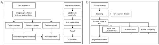 The workflow of an object detection system incorporating data augmentation techniques is illustrated. (A) This comprehensive process begins with data acquisition, followed by preprocessing and image augmentation. The augmented images are used for model training, after which the model undergoes validation and testing. Once trained, the model is applied to new test images to detect objects, with performance evaluated using the Intersection-over-Union (IoU) metric. (B) Various augmentation techniques are applied to the original dataset, creating an enhanced and diversified dataset.
