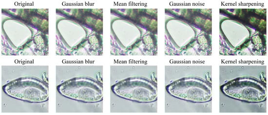A series of microscopic images illustrating the impact of various image augmentation techniques on two distinct classes (class 0 and class 1). The first column features the original, unaltered images. Moving to the right, each subsequent column reveals the transformed images after applying different augmentation methods: Gaussian blur, mean filtering, Gaussian noise, and kernel sharpening. These techniques introduce a range of visual variations and distortions, enriching the dataset. By incorporating these augmentations, the goal is to bolster the robustness and enhance the generalization capabilities of the machine learning model trained on this enriched dataset. The upper row of images represents class 0, and the lower row represents class 1.