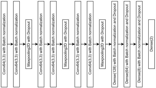 Our CNN model presented in Figure 3 is structured to perform a binary classification task, as indicated by its final output layer. The architecture begins with a sequence of convolutional layers, each utilizing 64 filters with a 3 × 3 kernel size. These layers are followed by batch normalization, which is implemented to enhance training stability and efficiency by normalizing the activations across mini-batches. After every two convolutional layers, max pooling is applied to downsample the spatial dimensions of the feature maps, thereby reducing computational complexity and emphasizing the most critical features. To further prevent overfitting, dropout is introduced following the max-pooling layers, randomly omitting units during training. The model then progresses from convolutional operations to fully connected layers, comprising three dense layers with 128, 64, and 8 units, respectively. Each dense layer is also followed by batch normalization and dropout to maintain regularization. The final dense layer contains two units, making it appropriate for binary classification tasks. This architecture, characterized by its depth and the integration of multiple regularization techniques, is designed to effectively manage complex data while minimizing the risk of overfitting.