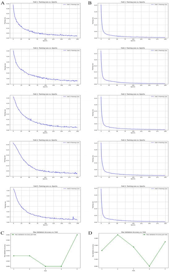 Outcomes of training and validating machine learning model. Results of five-fold cross-validation training loss. (A) Non-augmented image dataset. (B) Augmented image dataset. Relationship between prediction accuracy and number of folds used in cross-validation for image datasets. (C) Non-augmented image dataset. (D) Augmented image dataset.