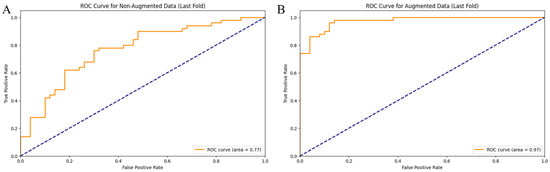 Receiver operating characteristic (ROC) curves for binary classification model trained on two different datasets. (A) Non-augmented image dataset. (B) Augmented image dataset. The orange line indicates the correct positives and misclassified negatives, highlighting the model’s class distinction ability. The blue dashed line indicates an AUC value of 0.5, suggesting no discriminative power.