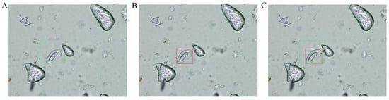 A detailed comparison between the object detection results of a highly trained machine learning model, Xception, and the annotations made by expert medical staff on the microscopic images. (A) The objects detected by the Xception model, highlighted by green bounding boxes. (B) The annotations made by a parasitology expert, indicated by red bounding boxes. (C) A combined view, displaying both the expert annotations (red bounding boxes) and the model’s predictions (green bounding boxes).