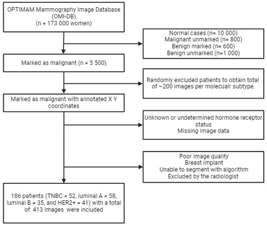 A flowchart of the in- and exclusion criteria is depicted in Figure 1. During this study, all types of lesions, including masses, calcifications, architectural distortions, and asymmetries, were included. The inclusion criteria for the study were as follows: (I) malignantly proven DM images; (II) determined hormone receptor status; and (III) annotated ROIs by expert radiologists. Patients were excluded if they had the following: (I) missing image data; (II) poor DM image quality, (III) breast implants; (IV) a DM image that could not be segmented; or (V) incorrect image segmentation determined by a radiologist. Finally, a total of 186 patients were included in the study, grouped as follows: 58 luminal A, 35 luminal B, 52 TNBC, and 41 HER2. The images were translated into a total of 413 images, including cranio caudal (CC) and mediolateral oblique (MLO) views. Combining CC and MLO views has shown improved classification performance [18,19]. The included images were divided into a training set (70%) and a testing set (30%).