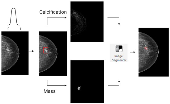 Figure 2. The tumor segmentation process. Starting with normalization of the original DM image, where breast lesions (red) classified as ‘calcification’ underwent image enhancement. Breast lesions classified as ‘mass’ underwent segmentation using a region-growing algorithm. The segmentations were finalized with the use of the image segmenter tool from MATLAB to obtain the final tumor segmentation.