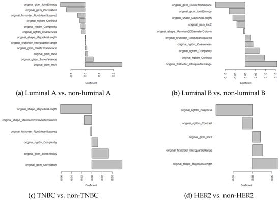 Figure 5. The selected radiomic features for (a) luminal A vs. non-luminal A, (b) luminal B vs. non-luminal B, (c) TNBC vs. non-TNBC, and (d) HER2 vs. non-HER2 classification tasks.