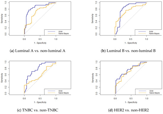 Figure 6. The ROC curves of the SVM (blue) and NB (yellow) classifiers for (a) luminal A vs. non-luminal A, (b) luminal B vs. non-luminal B, (c) TNBC vs. non-TNBC, and (d) HER2 vs. non-HER2.
