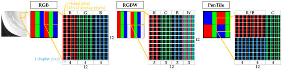 We generated image stimuli using simulation methods from previous studies to prepare stimuli with different display sub-pixel arrays [,]. First, we describe the generation method. Given that the display used in the experiment (ColorEdge PROMINENCE CG3146, EIZO Corp., Ishikawa, Japan) has an RGB sub-pixel array, we treated 12 × 12 pixels of the actual display as one virtual pixel. The three sub-pixel array configurations used in the experiment—RGB, RGBW, and PenTile—are shown in Figure 1. To standardize the virtual pixel widths for each sub-pixel array, we set the virtual sub-pixel width as follows: 4 × 12 pixels for RGB, 3 × 12 pixels RGBW, and 8 × 12 pixels for the R and B sub-pixels and 4 × 12 pixels for the G sub-pixel in PenTile. To control conditions, the aperture ratio of the virtual sub-pixels was unified to 100% for all experimental stimuli. A spectroradiometer (CS-2000, Konica Minolta, Inc., Tokyo, Japan) was used to ensure that differences in luminance did not affect the evaluation by adjusting pixel values so that the average luminance of the experimental stimuli was equal across the three sub-pixel arrays. White was set to 334.2 cd/m2, ensuring the maximum luminance was consistent for each sub-pixel array. The 12 × 12 pixels of the experimental stimulus, created by this procedure, were considered as one virtual pixel. Consequently, evaluating the experimental stimuli with three different sub-pixel arrays was possible by observing one virtual pixel from a viewing distance 12 times that of one real pixel.