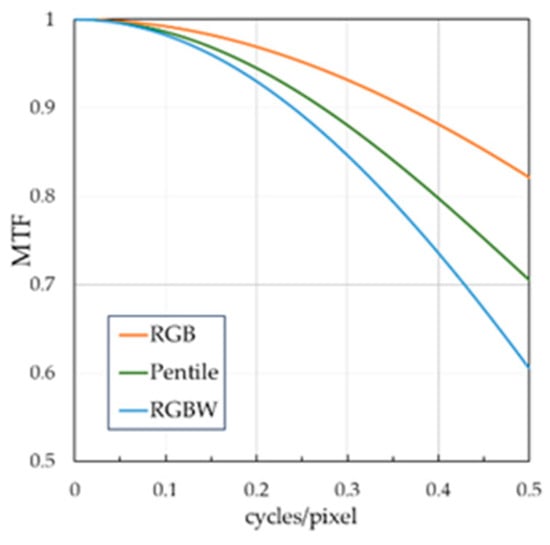 Figure 3 illustrates a graph of the calculated MTFs for the three sub-pixel arrays used in the experiment. According to the MTF values, the superiority relationship among the sub-pixel arrays was RGB > PenTile > RGBW. At the Nyquist spatial frequency of 0.5 cycles/pixel, the MTF differences between the RGB and RGBW, RGBW and PenTile, and PenTile and RGB sub-pixel arrays were approximately 21.6%, 10.0%, and 11.6%, respectively.