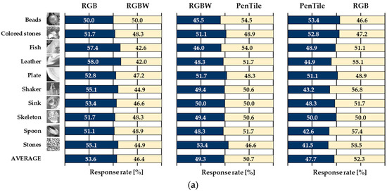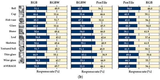 The average response rate of the 11 respondents who answered which stimulus was more glossy/transparent for each experimental stimulus pair is shown in Figure 4. The p-values, standard deviations, and effect sizes and their indices, indicating whether there is a significant difference between the stimulus pairs of the corresponding sub-pixel array, are shown in Table 1. Cohen’s standard deviation was used to calculate the effect size to confirm whether there was a significant difference, and the closest index was selected with reference to Sawilowsky and Cohen for the determination of the effect size index [,]. The p-value, indicating significant differences between average response rates, revealed that the RGB sub-pixel array scored significantly higher in the RGB-RGBW stimulus pair for glossiness, and the PenTile sub-pixel array scored significantly higher in the PenTile-RGB stimulus pair for transparency. Although the response rate varies by image, the overall trend indicates that these pairs are significantly different, even when effect sizes independent of sample size are considered. In addition, when examining the relative shitsukan relationships between stimulus pairs in terms of effect sizes, a general relationship of RGB > PenTile > RGBW (consistent with the MTF superiority relationship) for glossiness and RGB > RGBW > PenTile (opposite to the MTF superiority relationship between PenTile and RGBW) for transparency is found.