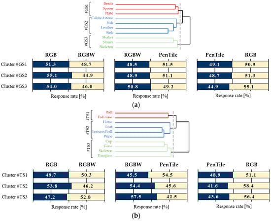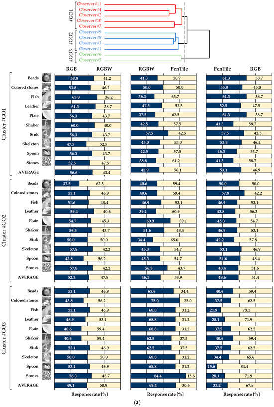 The glossiness shown in Table 2 and Figure 5a can be classified into Cluster #GO1 (5 observers), Cluster #GO2 (4 observers), and Cluster #GO3 (2 observers). The response rates for each cluster confirm the relationships PenTile > RGB > RGBW for Cluster #GO1, RGB > PenTile > RGBW for Cluster #GO2, and RGBW > RGB > PenTile for Cluster #GO3. From Table 2, the significance of the superiority-inferiority relationships reveals that in Cluster #GO1, the difference between RGBW and other sub-pixel arrays is particularly large (effect size: huge), while in Cluster #GO3, the difference between PenTile and other sub-pixel arrays is also notably large (effect size: huge). Observers in Cluster #GO1 perceive glossiness as significantly lower with RGBW, while those in Cluster #GO3 perceive glossiness as significantly lower with PenTile. Conversely, Cluster #GO2 shows a milder effect size, indicating that the sub-pixel array has no significant effect on glossiness perception. However, response rates for stimuli such as Beads, Plate, and Sink in Cluster #GO2 exceed 60%, suggesting that the sub-pixel array does affect glossiness perception depending on the stimulus object.