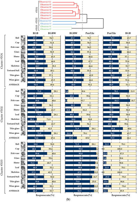 The transparency shown in Table 2b and Figure 5b was categorized into Cluster #TO1 (7 observers), Cluster #TO2 (2 observers), and Cluster #TO3 (2 observers). The response rate for Cluster #TO1 indicates that there is a relationship of RGB > PenTile > RGBW, but because the effect size is small, observers in this cluster do not seem to be significantly affected by differences in the sub-pixel array in their perception of transparency. In Cluster #TO2, there is a relationship of PenTile > RGB > RGBW, and the difference between PenTile and other arrays (effect size: very large and large) is particularly perceived, as confirmed by the response rate and effect size. The response rate for each stimulus in Cluster #TO2 shows a number of response rates above the 75% general significance level for the two choices. However, some stimuli do not follow the average trend for the corresponding pair, such as Thin glass in the RGBW-PenTile pair (71.9–28.1%) and Skeleton in the RGB-RGBW pair (28.1–71.9%). Thus, the combination of image features and sub-pixel confirms that the appearance of transparency changes depending on the combination of image characteristics and sub-pixel array of the stimuli, and that it influences observers’ responses. Finally, the perceived transparency of Cluster #TO3 has a relationship of RGBW > RGB > PenTile, where the effect size is large and the p-value is significant, clearly indicating that the sub-pixel array has a significant effect on the perceived transparency. In terms of response rate details, Pentile was significantly less transparent for both image stimuli.