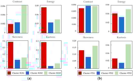 Detailed examination of each cluster reveals that image stimuli in Cluster #GS1 exhibit global gloss spread over the entire smooth object surface. According to Hunter’s definition of gloss [], these stimuli represent ‘distinctness-of-image (DOI) gloss’ or ‘absence-of-bloom gloss. Notably, dark regions, such as black, are widely distributed near the object’s gloss in these images, enhancing the object’s glossiness. As shown in Figure 7a, the values of Energy, Skewness, and Kurtosis for Cluster #GS1 are higher than those for other stimuli, indicating that these features contribute to a higher perception of glossiness, as reported in previous studies [].