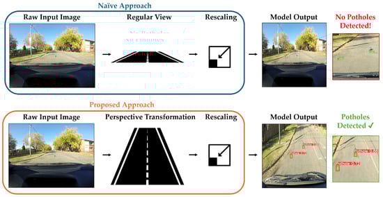 Comparison between the naive approach and our proposed approach. The naive approach involves loading the raw input image and then simply downscaling it to the required input resolution for the object detection network, losing significant image features and resulting in undetected potholes. Meanwhile, our approach demonstrates successful and robust pothole detection by transforming the input image to primarily retain the region of interest and minimize irrelevant segments of the image. Ground-truth pothole labels and predicted potholes are represented by green and red bounding boxes, respectively. Street and rescaling icons created by Trevor Dsouza and Doodle Icons via TheNounProject.com (accessed on 1 August 2024).