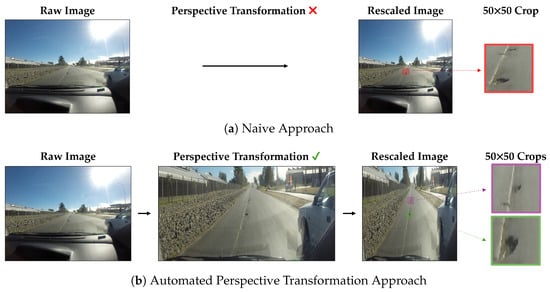 Comparison of the resulting preprocessed input images between (a) the naive approach and (b) the automated perspective transformation approach. The naive approach involves reading the image as is and then downscaling to a fixed input resolution (800800 in this example). A 5050 image crop demonstrates very low resolution for the potholes in the scene. Instead, our proposed approach transforms the image to mainly focus on the ROI (i.e., the street) where, after rescaling to the same input resolution, the resulting spatial resolutions of the potholes are much larger with clearer image features as depicted by the 50 × 50 image crops.