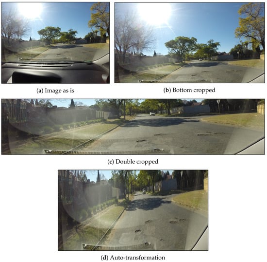 Raw images captured by cameras are typically of a high resolution, providing a great level of detail. However, due to design limitations and the need for real-time processing, most object detection networks are trained on fixed, low-resolution images [28,29,30]. For example, optimized real-time variants of SSD [29] and YOLOv3 [30] are designed for 300300 and 320320 resolutions, respectively. Meanwhile, the more recent YOLOv5 [28] has been tailored for an input spatial resolution of 640640. Although the trend demonstrates an increase in the models’ input resolutions, they are still quite small relative to raw camera output resolutions. Further, training these models on larger input resolution negatively impacts inference times [28,29], which is not ideal for real-time applications. This necessitates resizing the images to a predetermined, smaller size for effective training and generalization. However, when these images are resized, the features of small objects, such as potholes, can become significantly less discernible. Potholes may appear very small relative to the overall image size, resulting in insufficient features for the model to detect and differentiate them effectively, as shown in Figure 3. Furthermore, portions of the image that do not contain regions of interest, such as sidewalks or the sky, are often retained, limiting the focus on the relevant areas necessary for pothole detection. To improve detection accuracy, it is beneficial to adjust the image perspective to emphasize the road—the primary ROI—while minimizing the inclusion of non-essential parts of the image. This approach ensures that more useful features are preserved after rescaling, enhancing the model’s ability to detect potholes without significantly increasing computational overhead [31,32].