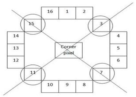 As shown in Figure 2, instead of testing all sixteen pixels, which is time consuming, the proposed hybrid algorithm tests only four pixels. This diagonal approach uses two slanting lines: one from pixel 3 to pixel 11 (right to left) and another from pixel 15 to pixel 7 (left to right). The intersection of these two diagonal lines identifies the center corner pixel. This method accelerates the process by reducing the number of comparisons. Finally, a local gradient method is applied to the center corner pixel to determine if the pixel’s distance is below or above the threshold value. The main advantage of the proposed algorithm is the reduction in both time and computational complexity compared to BRISK, FAST, MSER, MinEigen, ORB, and Harris algorithms. Additionally, the proposed algorithm outperforms existing algorithms in terms of match points and match rate.