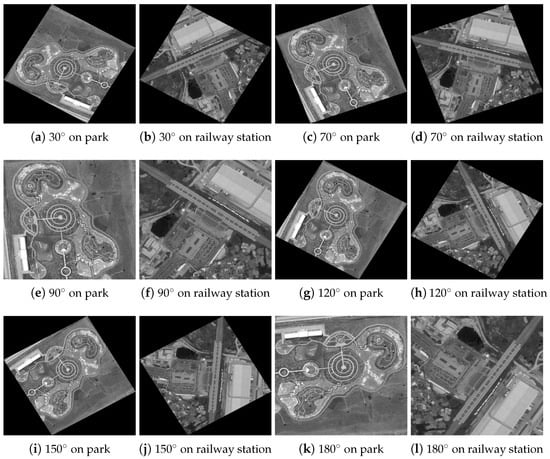 Various rotation angles applied on park and railway station grayscale aerial images.