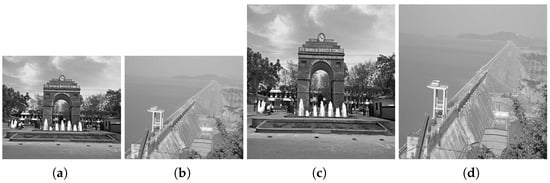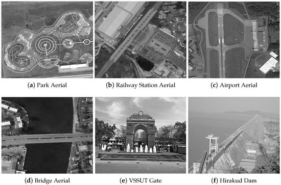 Figure 3 presents the original color aerial images from the AID database. Figure 4 shows these images converted to grayscale. Figure 5 illustrates the effects of various rotational angles applied to the park and railway station images. Figure 6 displays the scaling transformations applied to the VSSUT gate and Hirakud dam images.