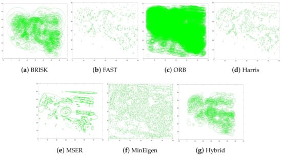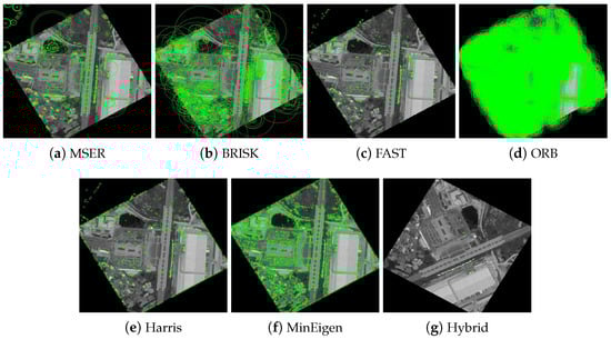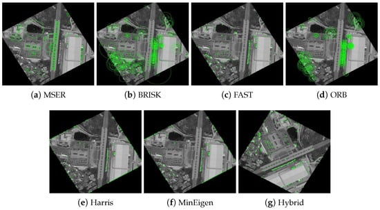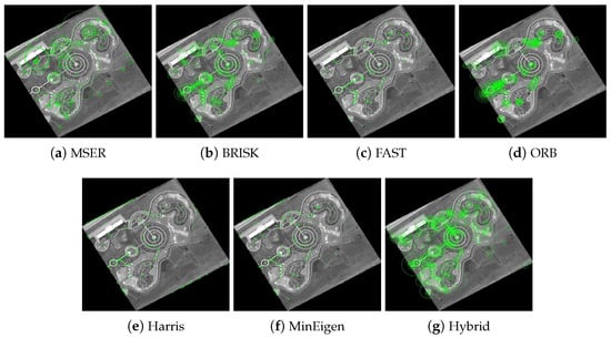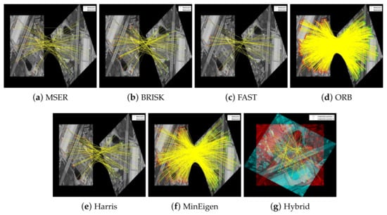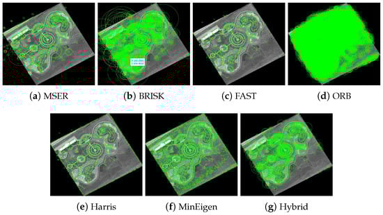 A comparative study of well-known feature detectors and descriptors, including SIFT, MSER with SIFT, SURF with SURF, BRISK with BRISK, FAST with BRIEF, and ORB with ORB, has been conducted []. Additionally, the performance of feature descriptors extracted by the Harris–Affine detector has been compared [].