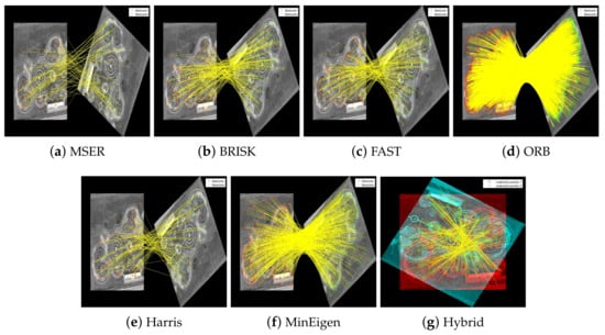 In a comprehensive comparison of feature detectors such as SIFT, ORB, AKAZE, BRISK, MinEigen, and SURF, SIFT and BRISK have been identified as more accurate, while ORB and BRISK demonstrate higher efficiency [,]. Additionally, SURF, BRISK, and SIFT are noted for their scale-invariance, with ORB being less so. This evaluation underscores the varying capabilities and suitability of these algorithms for different image-registration tasks, emphasizing the need for a hybrid approach to combine their strengths.