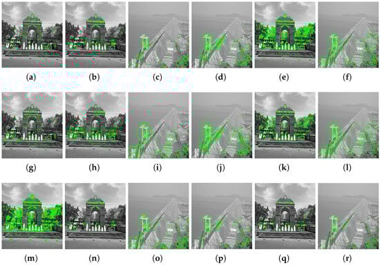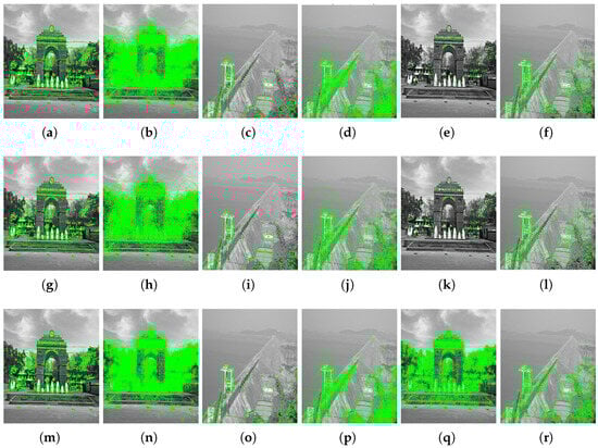 Extraction of feature keypoints using various extractors based on scaling factors of and . Each row demonstrates the impact of scaling on the effectiveness of feature extraction across different images and detectors. (a) MSER: VSSUT Gate Image. (b) BRISK: VSSUT Gate Image. (c) MSER: HD Image. (d) BRISK: HD Image. (e) Hybrid: VSSUT Gate Image. (f) Hybrid: HD Image. (g) MSER: VSSUT Gate Image, Scale 0.7. (h) BRISK: VSSUT Gate Image, Scale 0.7. (i) MSER: HD Image, Scale 0.7. (j) BRISK: HD Image, Scale 0.7. (k) Hybrid: VSSUT Gate Image, Scale 0.7. (l) Hybrid: HD Image, Scale 0.7. (m) MSER: VSSUT Gate Image, Scale 2.0. (n) BRISK: VSSUT Gate Image, Scale 2.0. (o) MSER: HD Image, Scale 2.0. (p) BRISK: HD Image, Scale 2.0. (q) Hybrid: VSSUT Gate Image, Scale 2.0. (r) Hybrid: HD Image, Scale 2.0.