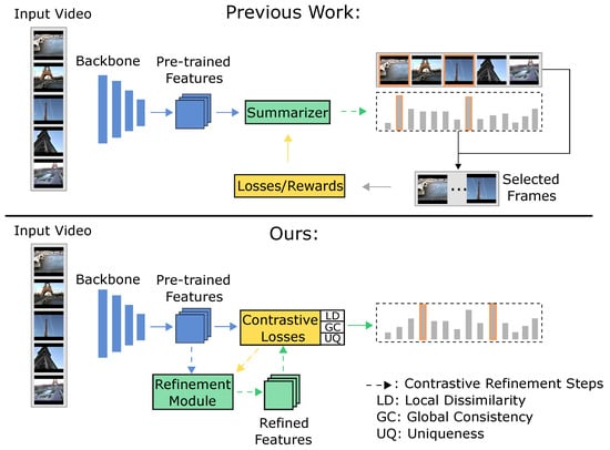 - Pang, Z.; Nakashima, Y.; Otani, M.; Nagahara, H. Contrastive Losses Are Natural Criteria for Unsupervised Video Summarization. In Proceedings of the IEEE/CVF Winter Conference on Applications of Computer Vision, WACV, Waikoloa, HI, USA, 2–7 January 2023. [Google Scholar]