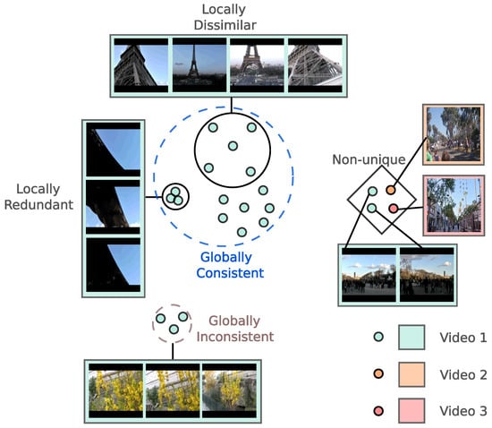 A conceptual illustration for the three metrics: local dissimilarity, global consistency, and uniqueness in the semantic space. The images come from the SumMe [34] and TVSum [31] datasets. The dots with the same color indicate features from the same video. For concise demonstration, we only show one frame for “Video 2” and “Video 3” to show the idea of uniqueness.