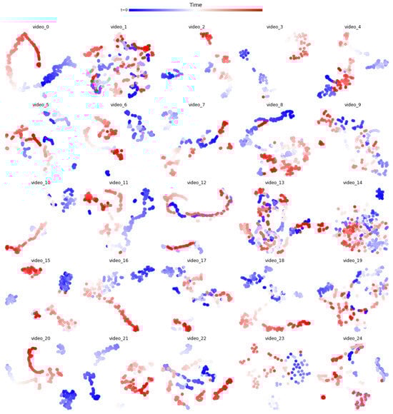 TSNE plots for all 25 SumMe videos. As can be observed, many videos contain features that slowly evolve and maintain an overall similarity among all the frames.
