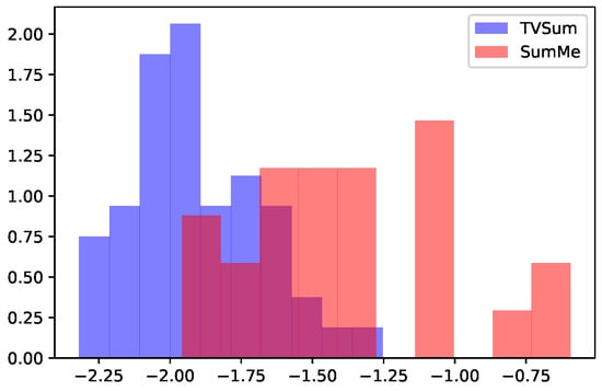 The histogram (density) of (before normalization) for TVSum and SumMe videos. SumMe videos have distinctly higher values than those for TVSum videos.