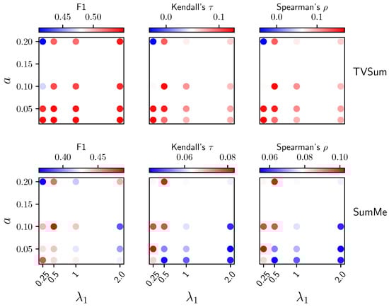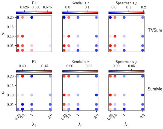 Ablations overanda. As shown in Figure 5, when & is used to produce importance scores, a larger a will make the TVSum performance unstable in terms of both F1 and correlation coefficients, although the SumMe performance is relatively more stable with respect to a. We hypothesize that when a becomes larger, the nearest neighbor set becomes noisier, diminishing the effectiveness of both the alignment loss during training and the local dissimilarity metric (post-training alignment loss) used for generating importance scores, due to the inclusion of semantically irrelevant neighbors. For , smaller values generally perform better when a has a reasonable value, as larger values of tend to make the uniformity loss suppress the alignment loss. Similarly, too small will make the alignment loss suppress the uniformity loss, as we observed unstable training when further decreasing . As shown in Figure 6, the analysis of the interaction between and a when using & & is used to produce importance scores, similar to that in Figure 5. However, we can see that the performance was improved for TVSum but undermined for SumMe due to incorporating .