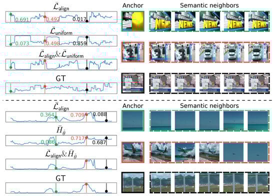 During the contrastive refinement, and will mutually resist each other for frames that have semantically meaningful nearest neighbors and are consistent with the video gist. Specifically, when a nontrivial number of frames beyond also share similar semantic information with the anchor , these frames function as “hard negatives” that prevent to be easily minimized [19,61]. Therefore, only frames with moderate local dissimilarity and global consistency will have balanced values for the two losses. In contrast, the other frames tend to have extreme values compared to those before the refinement.