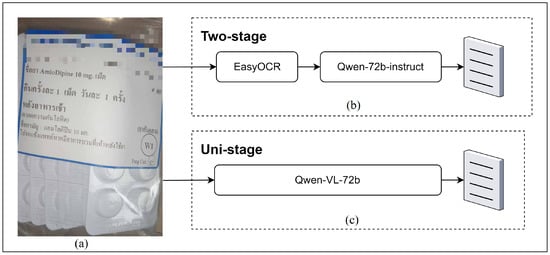 Workflow of Two-Stage and Uni-Stage models for drug label interpretation. (a) Input label (Amlodipine 10 mg) with Thai instructions, e.g., “take 1 tablet once a day, after breakfast”. (b) Two-stage model: EasyOCR extracts text, then Qwen-72b-instruct interprets it. (c) Uni-stage model: Qwen-VL-72b directly processes the image.