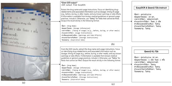 Recent advances in artificial intelligence (AI) applications within healthcare demonstrate transformative potential for medication management. From disease prediction to diagnostic imaging, AI technologies like Optical Character Recognition (OCR) and Large Language Models (LLMs) are evolving to provide effective support [,,,]. Combining OCR technology with LLMs or visual LLMs offers a novel way to assist elderly patients in reading and understanding medication labels, especially in scenarios where label clarity or text recognition may be inconsistent. OCR, particularly for Thai text, presents unique challenges, but the integration of LLMs can help refine and validate recognized text, enhancing accuracy and reliability [,].