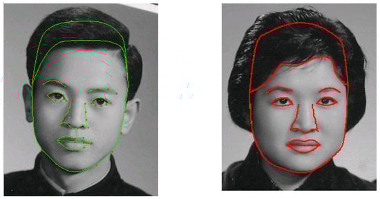The corresponding exterior and boundary curves of face images of the male (man) and female (woman), where the left shows the blending curves with characteristic nodes, and the right shows the blending curves (with the permission from Z.C. Li).