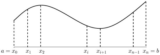 Consider the piecewise cubic polynomials , where denotes the set of functions having k-order continuous derivatives. Choose and . Assume that are given and the derivatives and on two boundary nodes are known (e.g., in Figure 7). For the function , denote