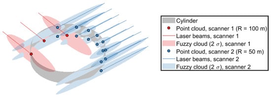 The approaches are compared for a cylinder with a radius and length of 5 and 25 cm, respectively, with the cylinder axis parallel to the z-axis. Scanner specifications correspond to the Faro Focus Plus series [], however, at half the resolution (i.e., a quarter of the number of points). The scanner is located 50 and/or 100 m away from the cylinder. When two scanners are simulated, they are 90 degrees apart as seen from the cylinder.