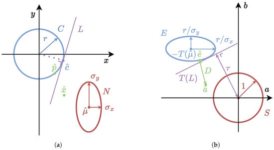 The circle C is therefore instead approximated by its envelope of tangent lines L with their point c ^ C . After translating and scaling the axes such that the distribution is a standard normal, the distance τ between μ ^ and the line is calculated and the expected squared Mahalanobis distance of this line follows from Equation (9), where we note that the subscripts denote the relevant dimension. The approach is illustrated in Figure 3, where without loss of generality axes x , y are aligned with the projected Gaussian’s axes with standard deviation σ x and σ y , respectively. Said axes become a , b after transformation to the standard normal.