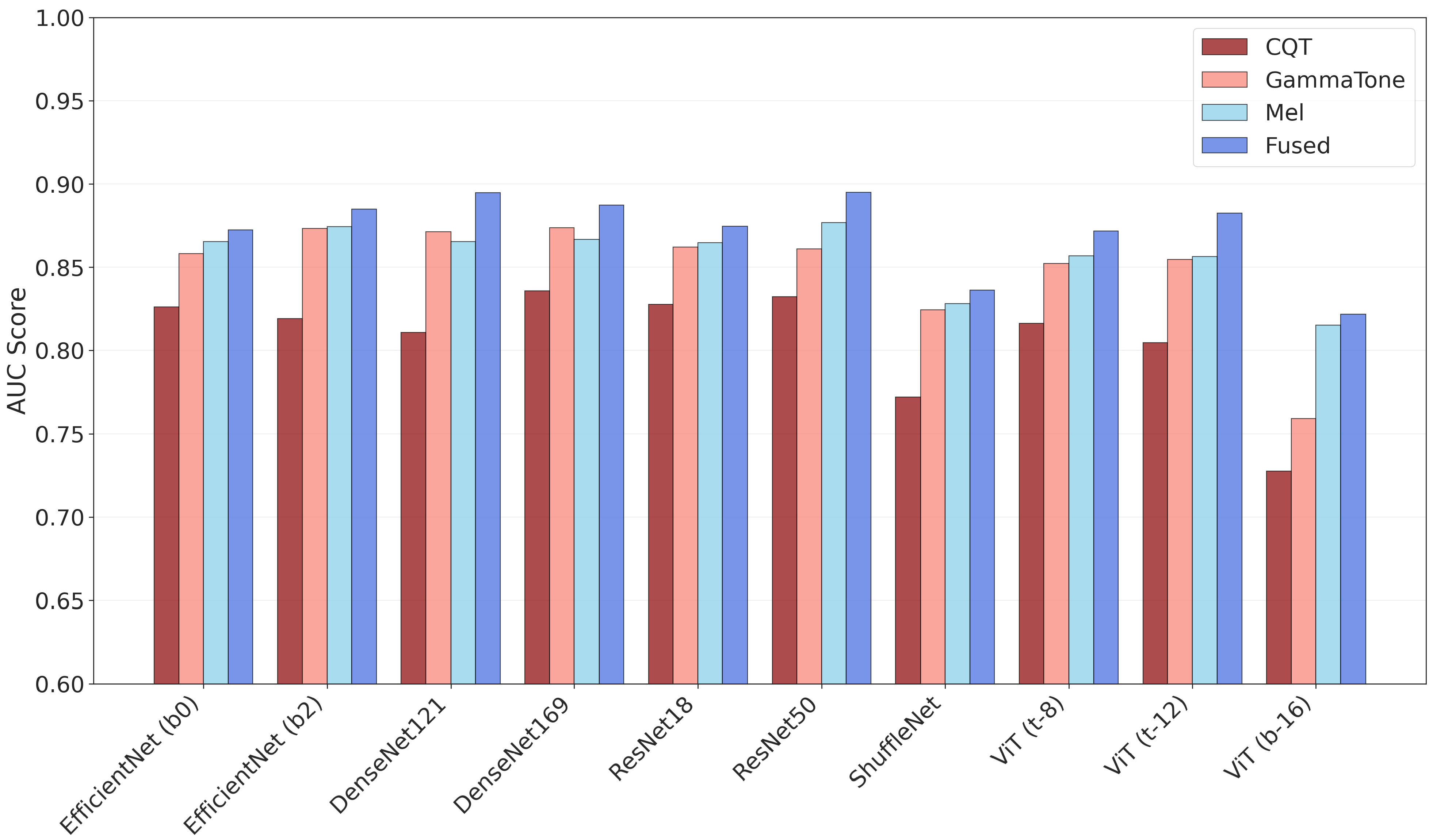 ViT (t) | CQT | 0.751 ± 0.086 | 0.743 ± 0.088 | 0.720 ± 0.105 | 0.776 ± 0.096 | 0.782 ± 0.119 | 0.804 ± 0.106 |
