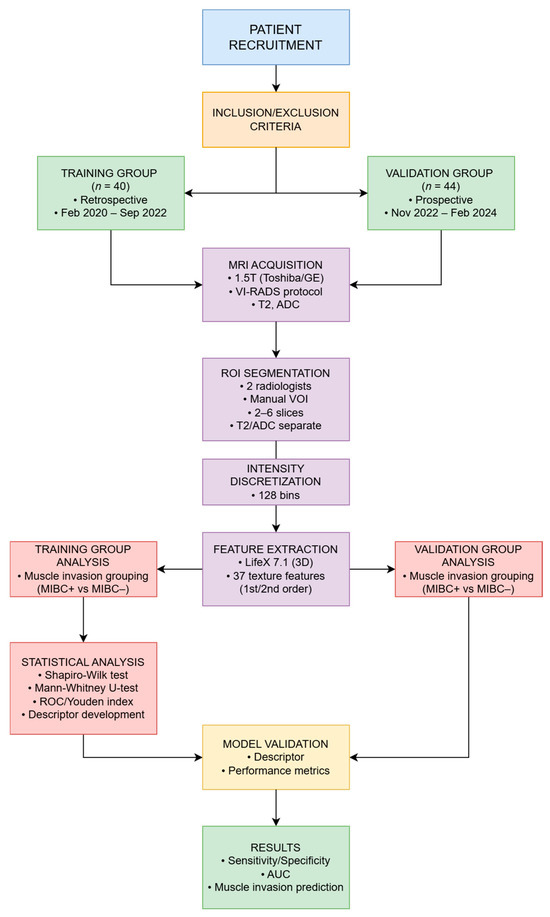 Kabanov D, Rubtsova N, Golbits A, Kaprin A, Sinitsyn V, Potievskiy M. Radiomics-Based Preoperative Assessment of Muscle-Invasive Bladder Cancer Using Combined T2 and ADC MRI: A Multicohort Validation Study. Journal of Imaging. 2025; 11(10):342. https://doi.org/10.3390/jimaging11100342