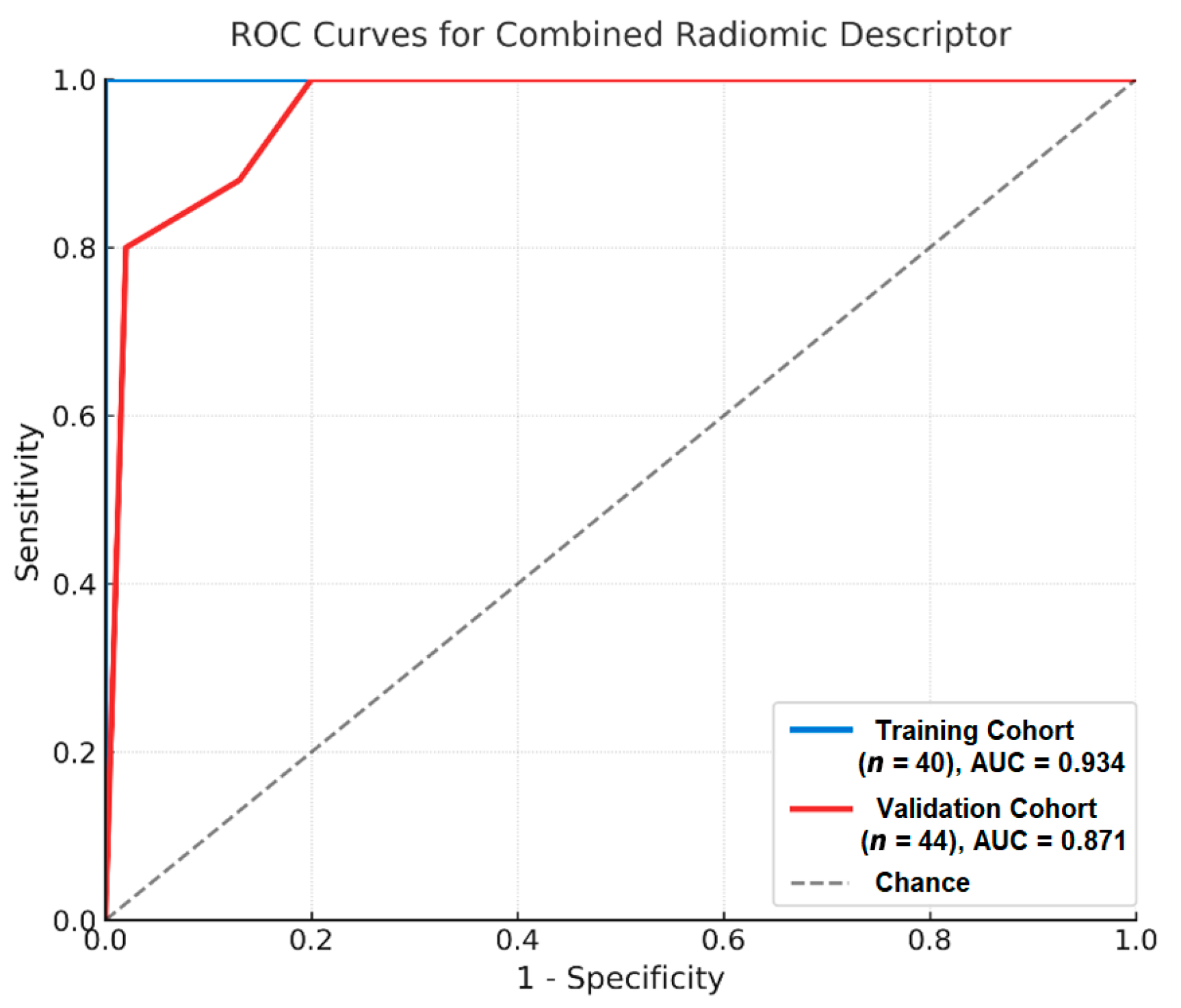 Metric | Training Cohort (n = 40) | Validation Cohort (n = 44) |