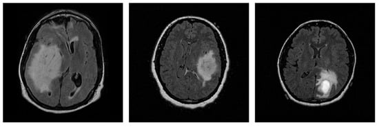 Representative 2D MRI slices of astrocytomas from each grade in the dataset: Grade 2 (left), Grade 3 (center), and Grade 4 (right).