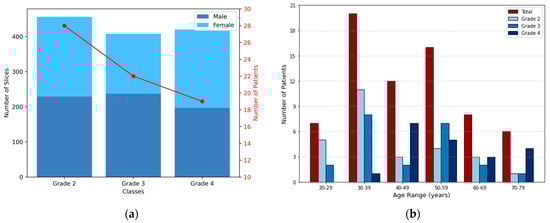 The distribution of MRI slices and patient demographics across the different astrocytoma grades is presented in Figure 2. In Figure 2a, color-coded bars indicate the number of slices per class (left y-axis), showing the gender distribution for visualization purposes. The red line represents the number of patients per grade (right y-axis). Figure 2b illustrates the age distribution in 10-year intervals. Dark red bars represent the total number of patients per interval, while shades of blue indicate grade-specific counts. The dataset consisted exclusively of adult patients (20–79 years), thus avoiding variability related to growth and development in pediatric cases.