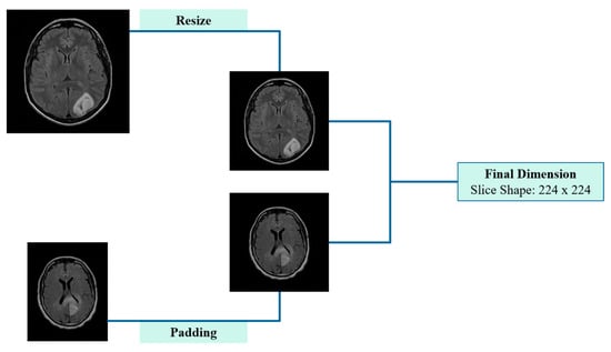 Initially, slices with one smaller dimension (e.g., 208 × 256 pixels) underwent zero-padding, where black (zero-intensity) pixels were symmetrically added to the smaller dimension, resulting in a square format. This step ensured aspect ratio preservation and prevented geometric distortion. Notably, this pre-processing approach is widely used in preparing input data for CNN, as it preserves classification accuracy while simultaneously reducing the training time [16]. The subsequent step involved resizing all slices, including those originally sized 256 × 256 or 512 × 512 pixels, to the target size, ensuring consistency in spatial resolution while maintaining anatomical integrity. Zero-padding and resizing procedures are visually summarized in Figure 3, after which the data were fully prepared for input into the CNN. The entire pre-processing workflow is visually summarized in Figure 3, after which the data were fully prepared for input into the CNN.