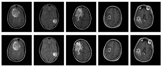 In medical imaging, including MRI scans, various sources of variation, such as artifacts caused by patient movement or acquisition inconsistencies, can affect image quality and, consequently, diagnostic assessments. These factors underscore the importance of evaluating the robustness of the proposed CNN under realistic perturbations, in addition to its generalization capabilities. For this purpose, mild geometry-based augmentations were applied exclusively to the training set, with each original slice replaced by a single augmented version, thereby ensuring that no augmented slice appeared in the test set, while simulating potential variability in real-world data. Specifically, random translations were performed by shifting the image up to 0.25% of its width or height, while random zoom operations were performed within a ±1% range. Additionally, random rotations were introduced, in 5% of a full cycle, corresponding to angular shifts of ±18 degrees. These augmentation parameters were configured within a safe and widely adopted range, as suggested in the literature [25,26], ensuring the preservation of diagnostic information, while evaluating the model’s performance under spatial variability. Figure 4 displays five original sample slices alongside their augmented counterparts, generated using random rotation, flipping, and shifting.