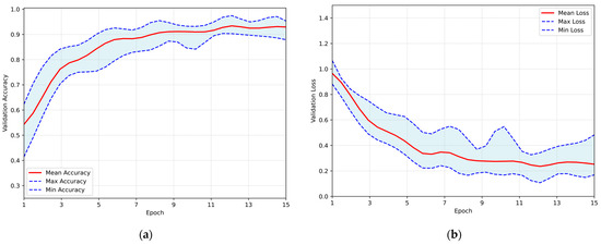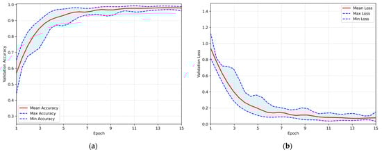 Mild augmentations were applied to the training sets to enhance the validation and generalization capability of the proposed architecture. This approach aimed to assess the proposed model’s performance under the influence of distorted representations of the dataset. The training results obtained by employing the same Repeated Hold-Out Validation strategy, are presented in Figure 8. The plot illustrates the validation accuracy and loss over the epochs, with the red line representing the mean performance and the shaded blue area indicating the performance range in both subfigures. The system demonstrated a peak average accuracy of 93.34% on the test set at the 12th epoch, with a standard deviation of ±2.07% and a corresponding 95% CI of 92.03–94.66%. At the same time, the model maintained a low loss rate, with the minimum average loss recorded at 0.236. This performance highlights the model’s robustness and its ability to generalize effectively to unseen data, even under augmented conditions.