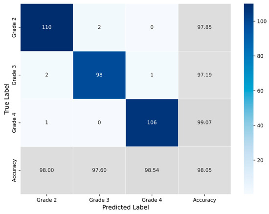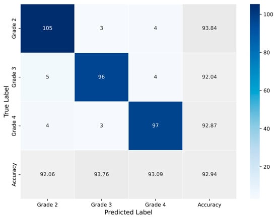 Subsequently, evaluation metrics were applied to assess the system’s overall performance. Figure 9 illustrates the confusion matrix, which displays the number of samples correctly and incorrectly classified per class after the augmented training. Additionally, Figure 10 presents the ROC-AUC curves derived from all runs after training with augmented data. The red line represents the mean ROC curve, while the shaded blue area indicates the performance range across the runs. The mean AUC is 0.986, maintaining a high level of classification performance, with minimal deviation from perfect classification, despite the altered dataset representations. Lastly, Table 5 summarizes the performance metrics derived from the confusion matrix for each class. Specifically, the table reports True Positives (TP), True Negatives (TN), False Positives (FP), False Negatives (FN), Accuracy (Acc), Specificity (Sp), Sensitivity (Se), and Precision (Pr), providing a detailed evaluation of the classification outcomes for each grade.