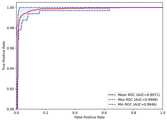 Receiver Operating Characteristic (ROC) curves of the Proposed CNN model for astrocytoma grade classification, aggregated across all runs. The mean ROC (AUC = 0.9971) reflects the model’s overall discriminative performance, while the maximum (AUC = 0.9998) and minimum (AUC = 0.9946) curves indicate the range of variability across runs.