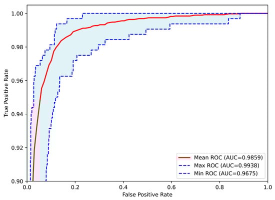 Receiver Operating Characteristic (ROC) curves of the Proposed CNN model for astrocytoma grade classification, trained on the augmented dataset and aggregated across all runs. The mean ROC (AUC = 0.9859) reflects the model’s overall discriminative performance, while the maximum (AUC = 0.9938) and minimum (AUC = 0.9675) curves indicate the range of variability across runs.