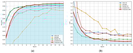 Comparison of the average evaluation metrics across training epochs for the proposed CNN and benchmark models (VGG-16, AlexNet, ResNet-50, and InceptionV3), using the Repeated Hold-Out validation technique: (a) average validation accuracy per epoch; (b) average validation loss per epoch. Blue areas in both (a) and (b) were created to highlight the performance of the proposed CNN, compared to the other networks.